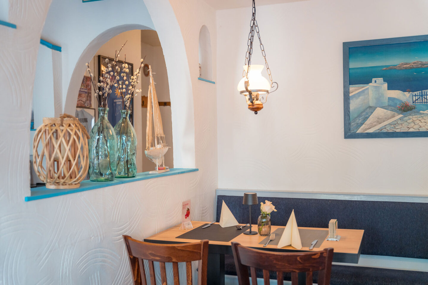 Neben dem Gastraum steht ein überdachter Außenbereich zur Verfügung, der auch bei wechselhaftem Wetter genutzt werden kann. Die Inneneinrichtung orientiert sich an typisch mediterranen Elementen und schafft eine ruhige, einladende Atmosphäre.